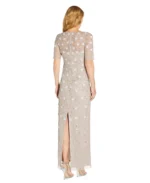 - Allover embellished; illusion neckline and sleeves; slit at back hem